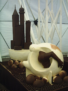 Ainda nunca tinha ido ao famoso Festival Internacional do Chocolate de Óbidos. Francamente fiquei desiludida. Um espaço pequeno, com poucas tendas. Aquilo na minha terra chama-se Feira, não Festival! Resumindo aquilo são tendas e cada uma vende produtos em/com chocolate: espetadas de fruta com chocolate, crepes com chocolate, licor de chocolate, chocolate, etc. É meramente comercial. Paga-se 5 euros de entrada e qualquer coisinha que se queira é pagar à parte. Estava a espera de mais. Algo com uma vertente mais lúdica, com provas, sei lá. E são só 6 esculturas expostas. Enfim, uma desilusão.